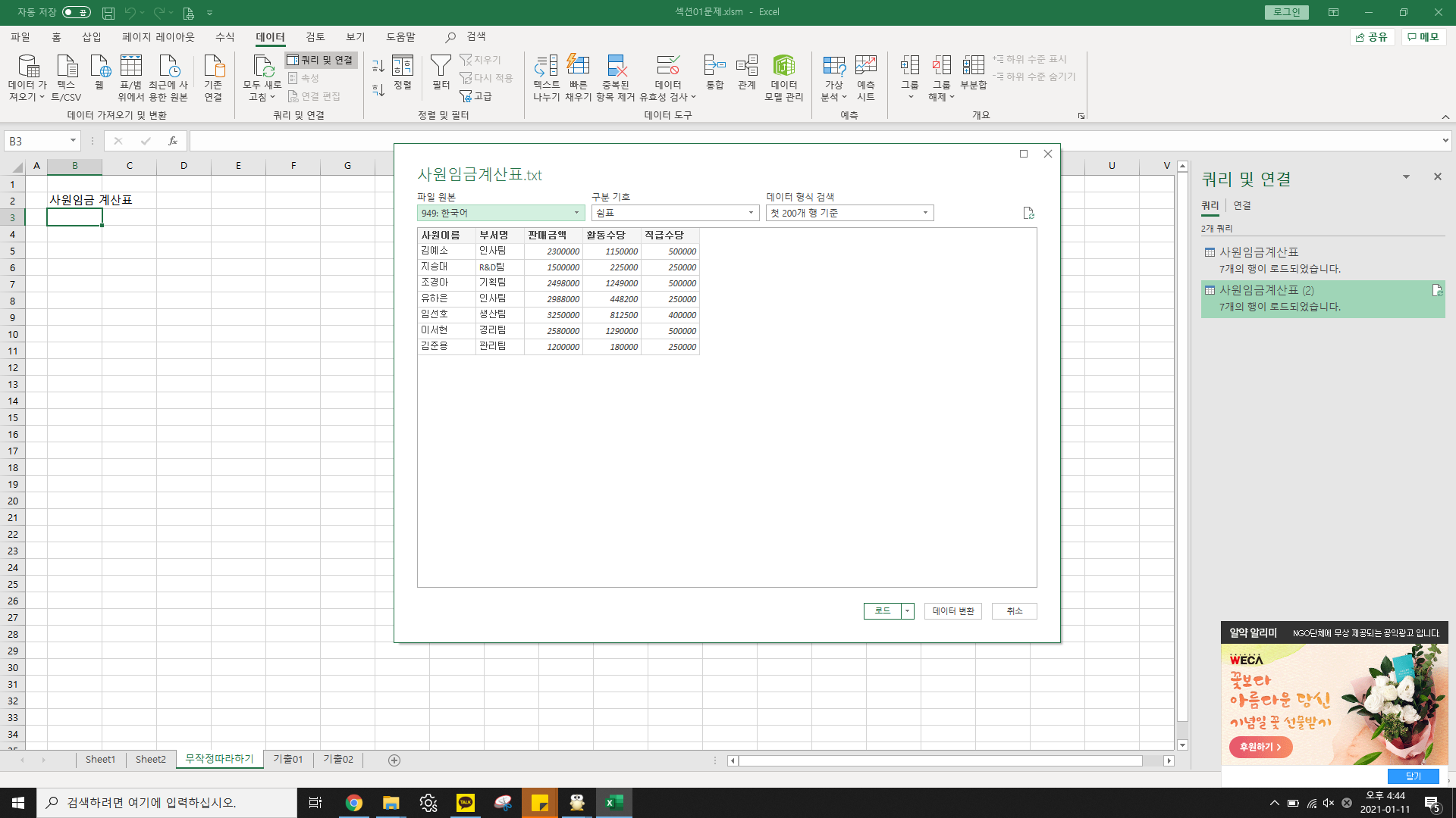 책에 나와 있는대로 텍스트 파일 가져오기를 눌렀더니 책의 사진 설명처럼 뜨지 않고 다음과 같이 뜹니다.