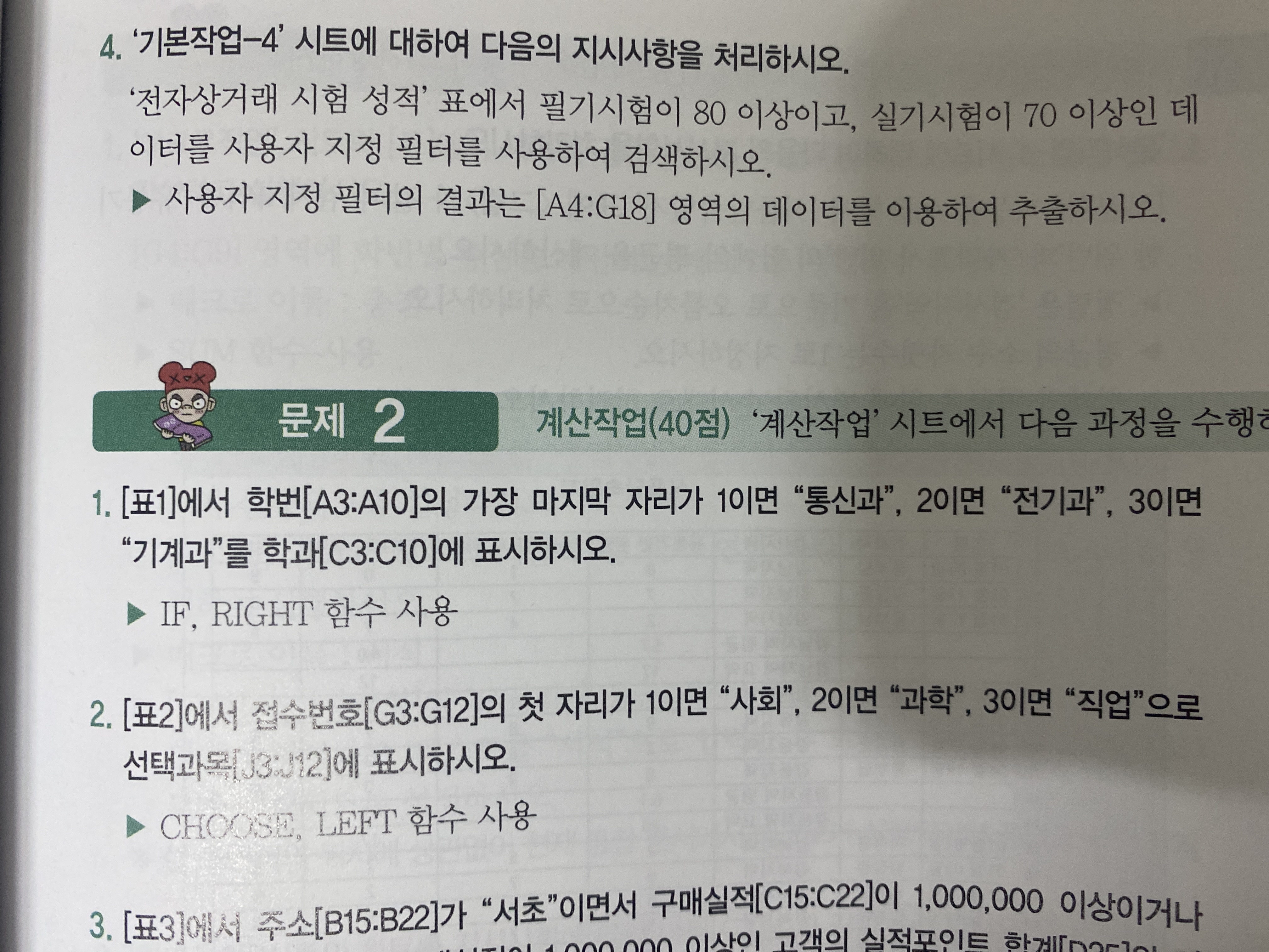 답지보니까 =if(right(a3,1)=“1”,통신과 ,if(right(a3,1)=“2”,전기과 , “기계과”)) 이렇게 적혀있는데