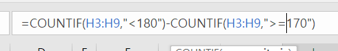 180 미만인 사람의 수를 구한 후 그 값에서 170 미만인 사람의 수를 빼면
