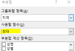 맞게 했는데 틀려서 봤더니 부분합 창에서 사용할 함수를 정할때 문제 풀이와 문제에서는 최대값이라고 돼있는데