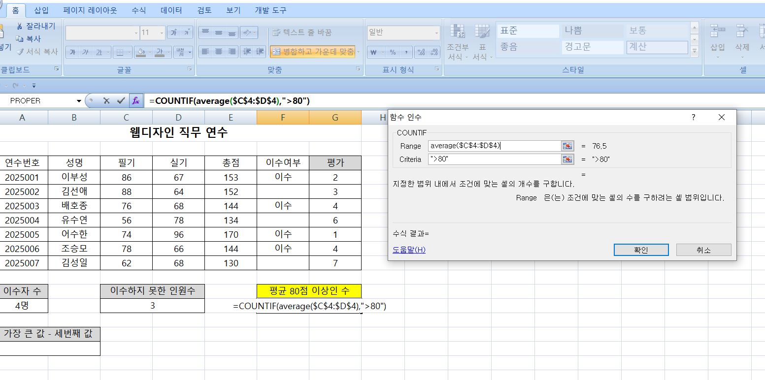 필기와 실기 두 과목의 평균이 80점 이상인 사람의 수를 구한다는 말씀인가요? 맞다면 countif 함수를 이용해서 구할 수는 없습니다.