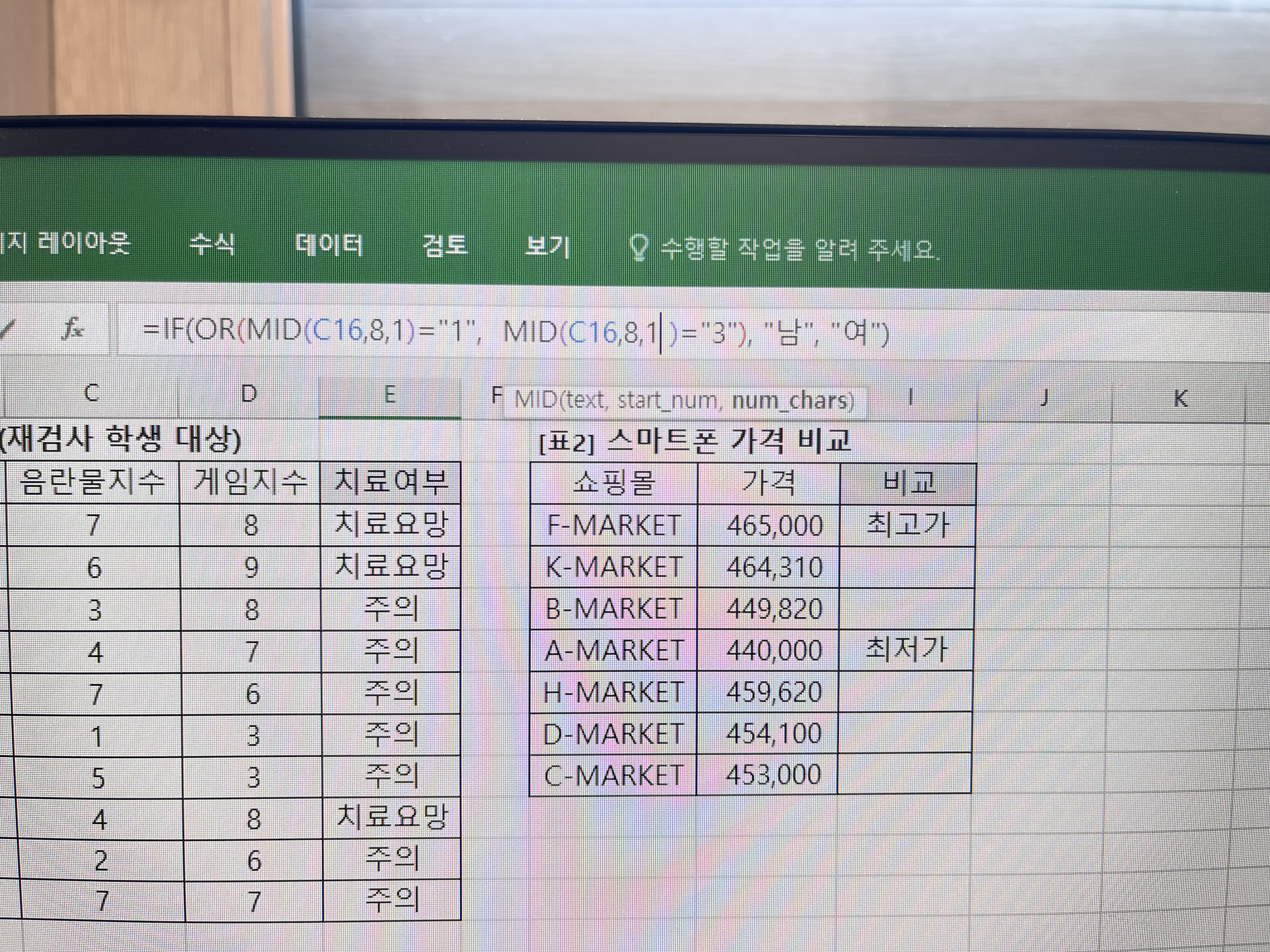 MID(C16, 8 ,1)은 [C16] 셀에서 8번째부터 한 글자를 추출해 오라는 의미입니다. 그런 다음 이 글자가 1인지 3인지 비교를 해야 하므로 OR(MID ( C16, 8 ,1 ) = "1" , MID ( C16, 8, 1 ) ="3" )으로 작성하는 것입니다.