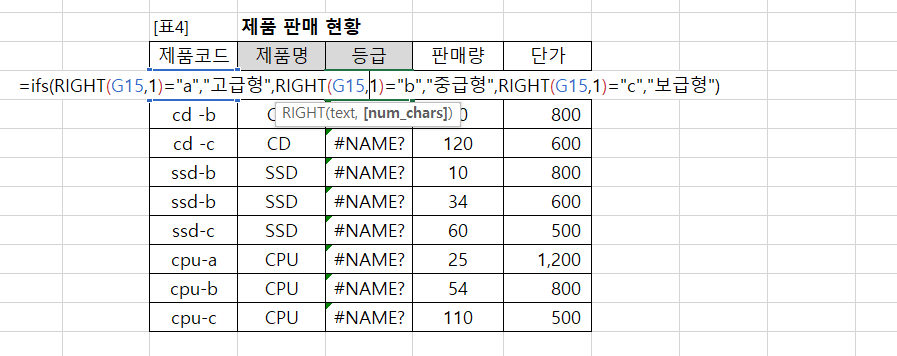 4번문제 =ifs(RIGHT(G15,1)="a","고급형",RIGHT(G15,1)="b","중급형",RIGHT(G15,1)="c","보급형") 제가 만든 함수 중 어디가 틀렸길래 name오류가 뜨는건가요 그리고ㅓname오류는 무엇인가요?