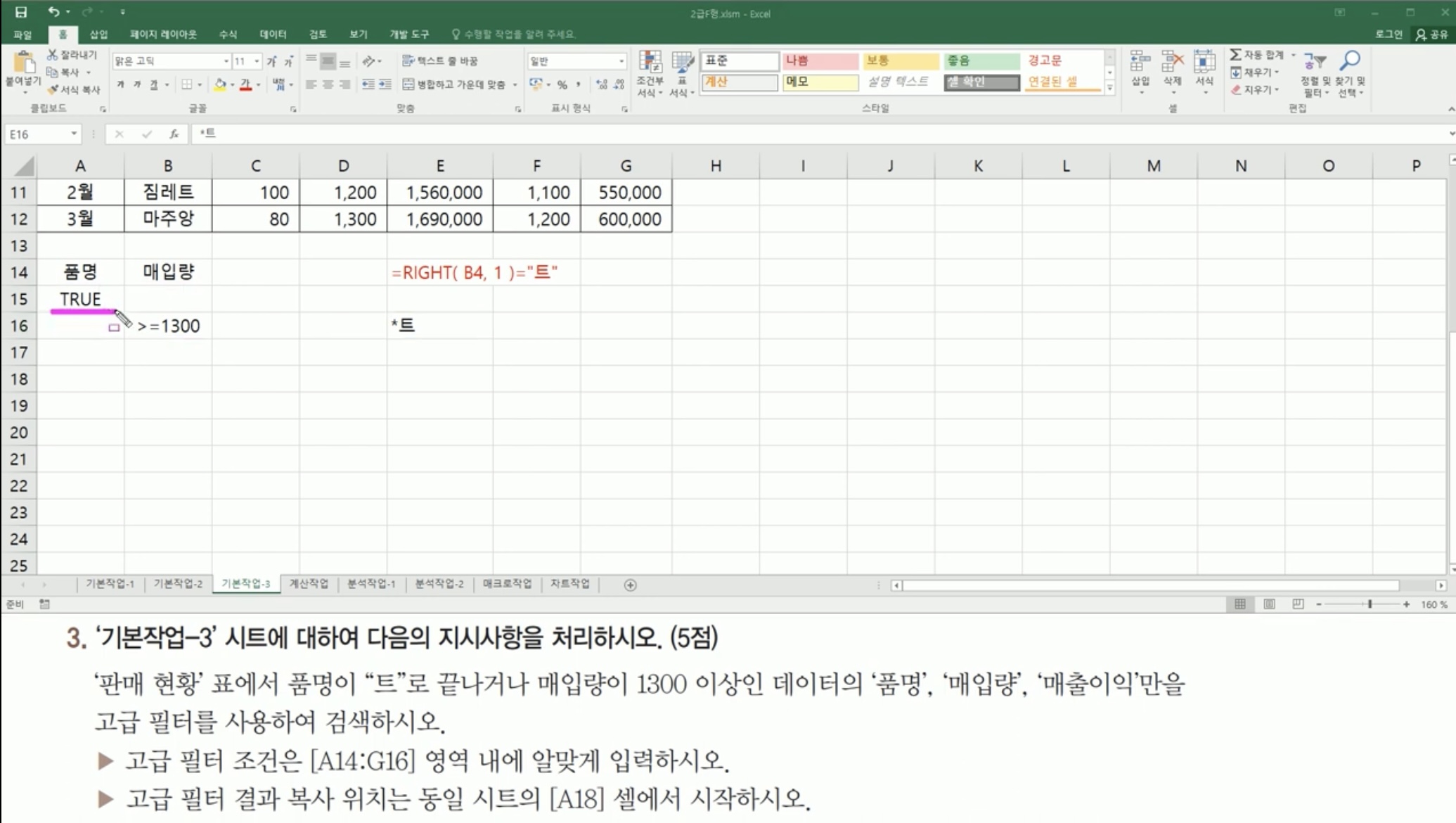 고급필터 조건에 ‘*트’가 아닌 right함수를 써서 입력해야 한다고 하셨는데