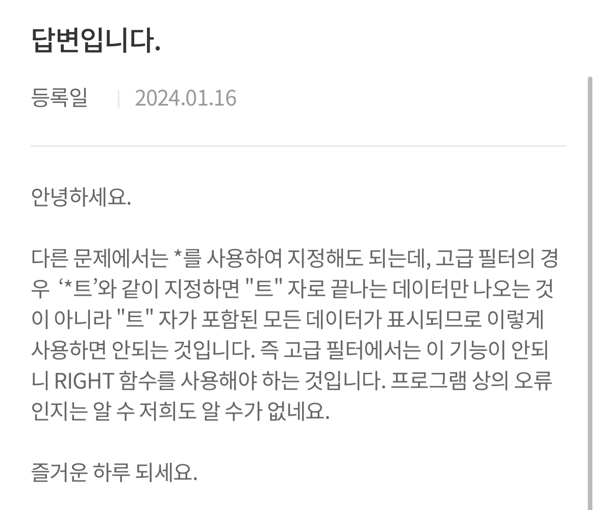고급필터의 경우에는 right함수와 같은 것을 사용해야한다고 하셨습니다.