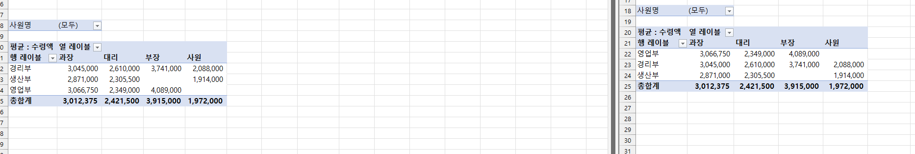 -피벗 테이블 결과 X [A22]에서의 값이 (영업부)로 정답(경리부)과 다릅니다.