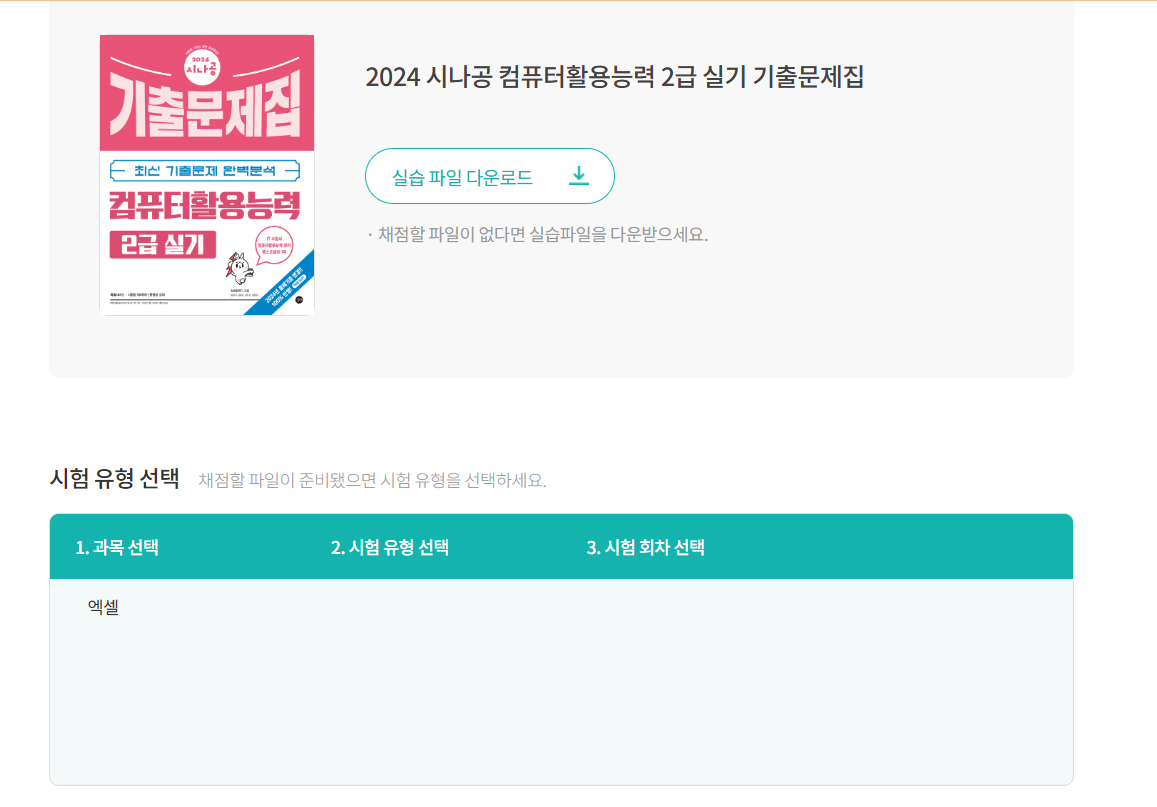 [컴퓨터활용능력]-[2급 실기]-[채점하기]를 클릭한 후 표시되는 교재 목록에서 2025년 기본서 교재를 선택하면 됩니다.