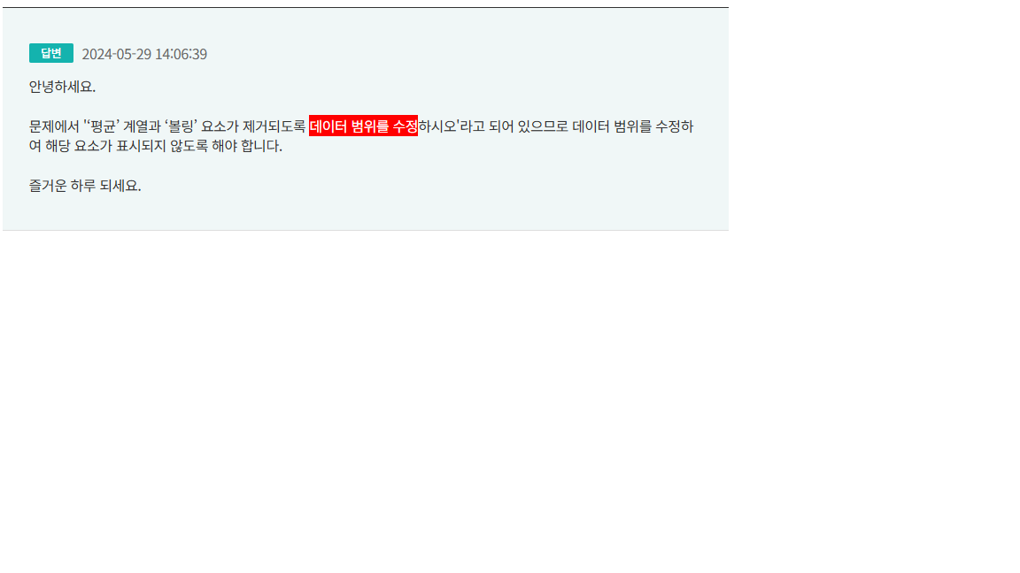 문제에서 '~~ 데이터 범위를 수정하시오'라고 되어 있는 것은 데이터 범위가 수정되도록 차트를 수정하는 것이 맞습니다. 차트에 데이터를 표시하는 방법이 여러 가지가 있다는 것을 보여드리기 위해 설명하다 보니 미쳐 이 부분은 생각하지 못했네요. 죄송합니다.