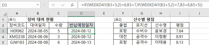 정답 수식 =IF(WEEKDAY(B3+5,2)=6,B3+7,IF(WEEKDAY(B3+5,2)=7,B3+6,B3+5))