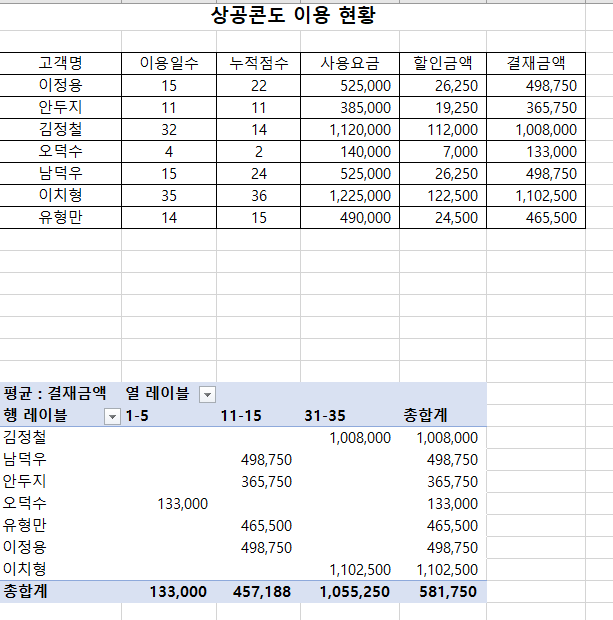 최근에 오피스 프로그램이 자동 업데이트 되면서 표시 형식이 지정된 상태로 피벗 테이블이 작성되고 있습니다. 하지만 실제 시험장에서는 교재와 동일하게 표시 형식이 지정되지 않은 상태로 피벗 테이블이 작성되니 그 상태 그대로 두면 됩니다.