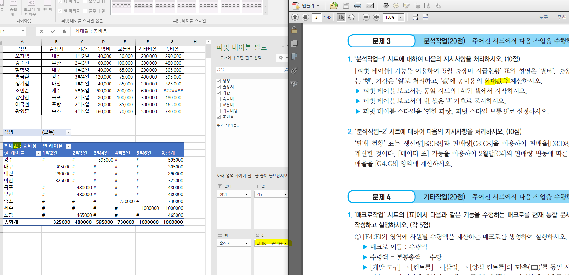 -피벗 테이블 결과 X [A17]에서의 값이 (최대값:총비용)로 정답(최대:총비용)과 다릅니다.