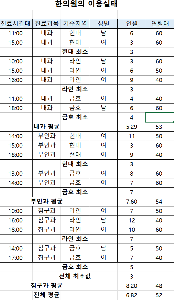 침구과 평균값이랑 전체 최소값의 위치가 바뀌어서 나타나는데 뭐가 문제일까요?
