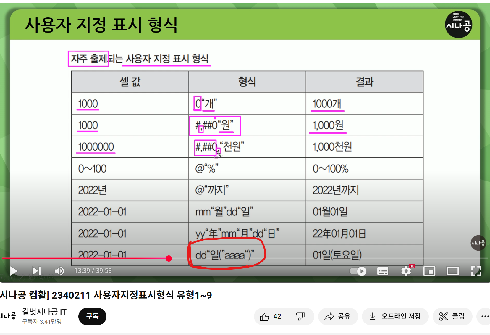책 21p [유형9]에는 dd"일"(aaaa) 라고 써야 맞다고 되어 있는데, 시나공 유튜브 동영상 강의에는 첨부한 이미지처럼 dd"일("aaaa")" 라고 써야 한다고 나와 있습니다.
