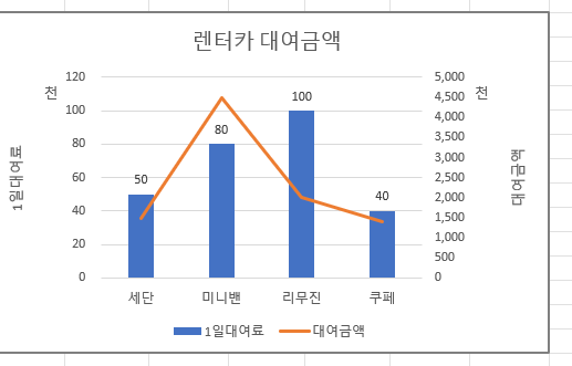 기타작업 2번문제의 2번항목인 '대여금액' 계열의 차트종류를 '표식이 있는 꺾은선형'으로 변경하고, '보조축'으로 지정하시오.에서