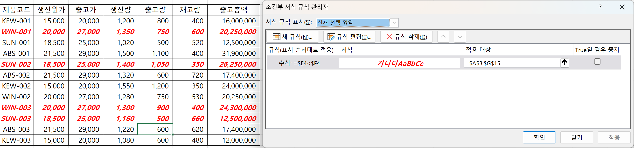 조건부 서식이 적용될 범위는 필드명이 있는 첫 행은 제외해야 합니다.