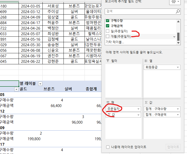 피벗 테이블에 주문일자를 행에 넣으면, 일(주문일자)&개월(주문일자)가 자동으로 생성됩니다. 문제에서는 따로 언급이 없으며, 영상에서는 자동으로 생성되지 않더라구요. 개인 설정 문제인가요? 아니면 따로 삭제를 해줘야하는 부분일까요??