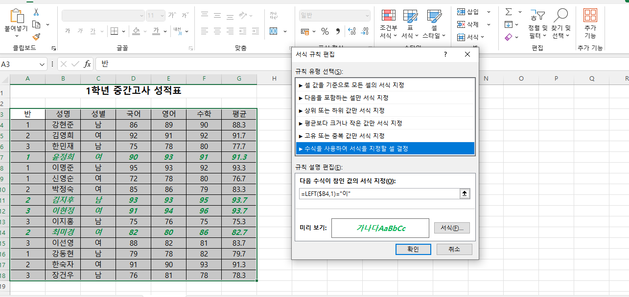 [A3:G18] 영역을 지정한 상태에서 다시 조건부 서식을 설정하세요.