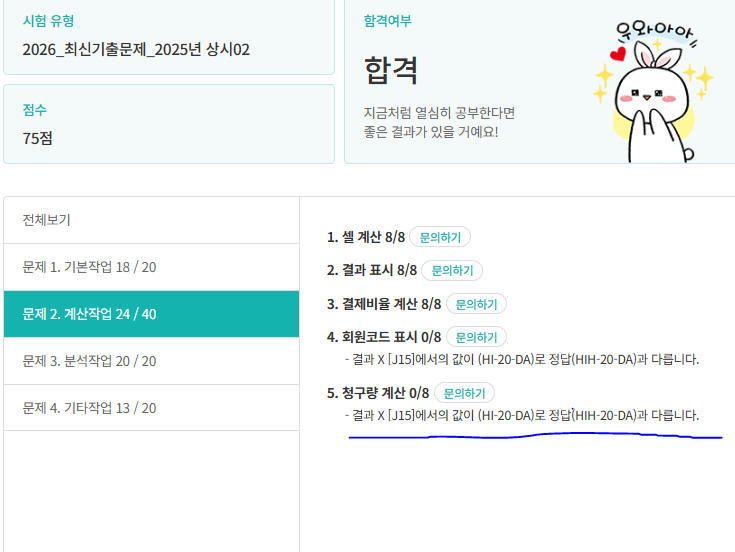 채점 결과는 [J15] 셀에 대한 내용입니다.