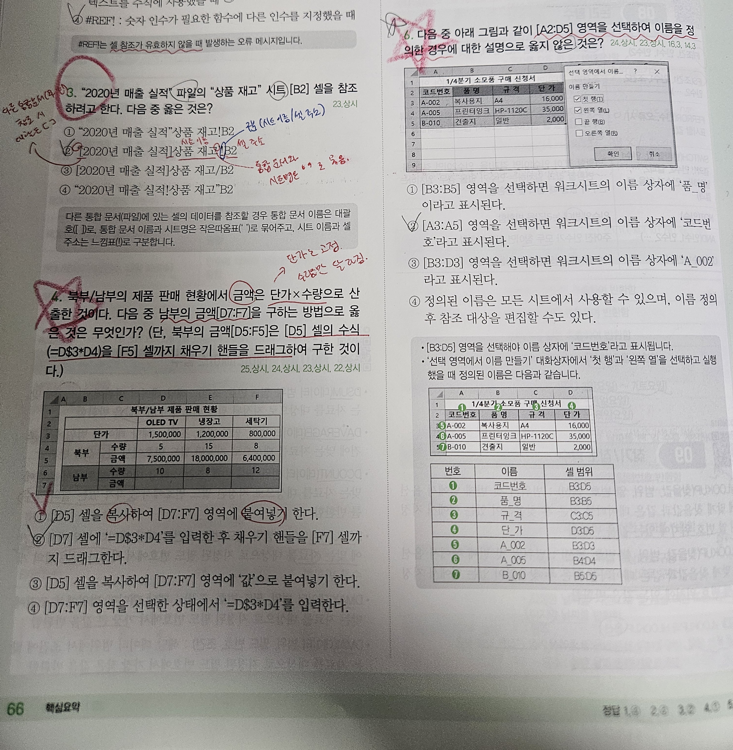그리고 6번 문제에서 '첫 행'과 '왼쪽 열'을 선택해 이름을 정의했을 때 왜 코드번호의 셀 범위가 A3:A5가 아닌 B3:D5인지 궁금합니다.