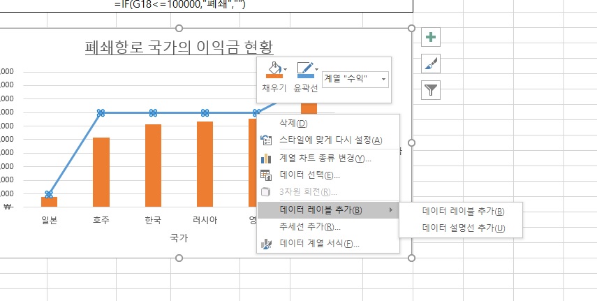 참고로 지금까지는 특정 계열 전체에만 데이터 레이블을 지정하는 문제가 출제되었습니다.