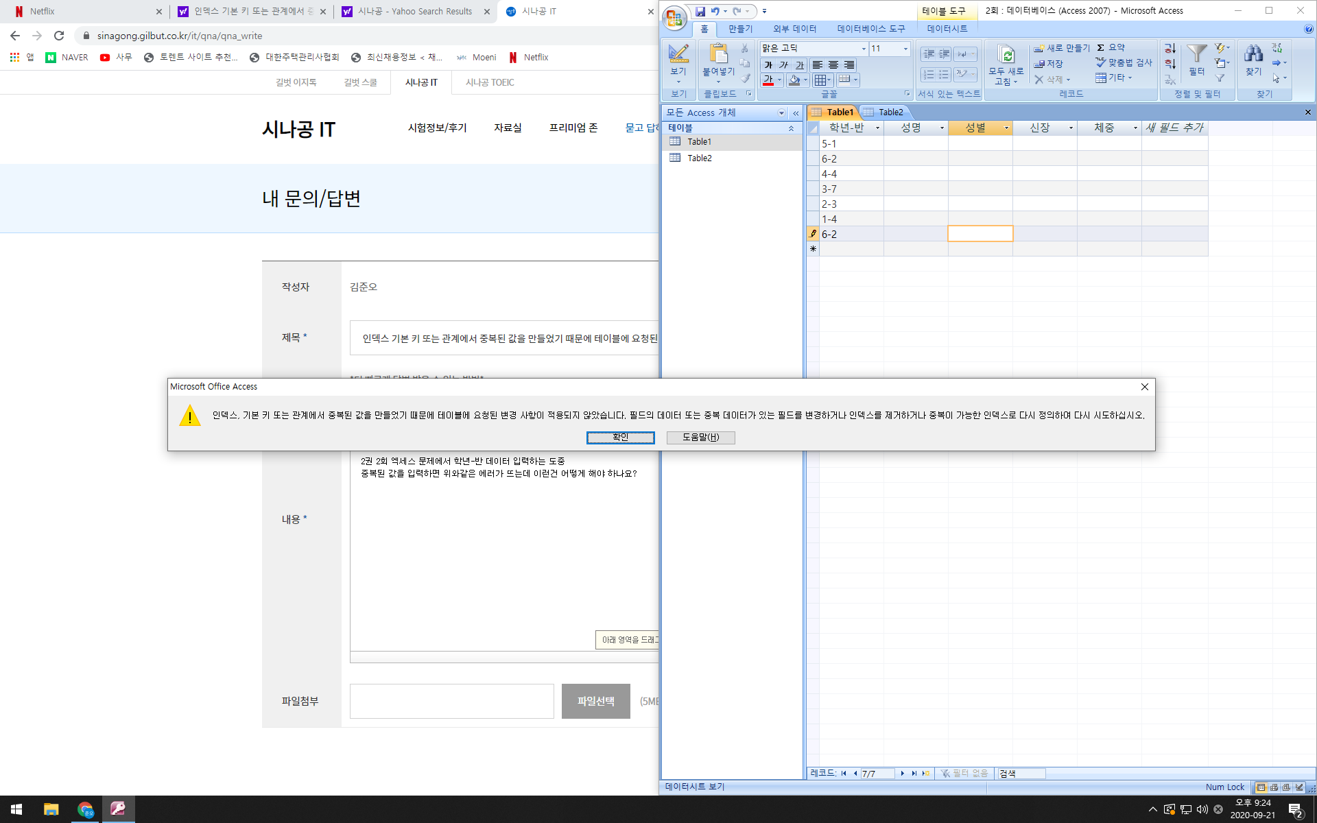 필드에 기본키가 지정되어 있을 경우 동일한 내용을 입력할 수 없는데 '학년-반' 필드에 기본키가 지정되어 있는 것 같습니다.