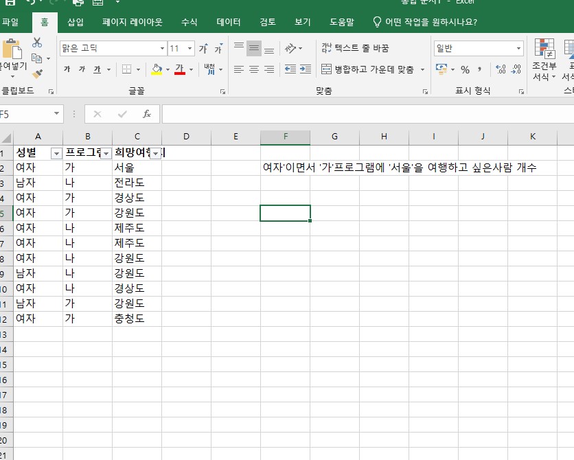 자동필터에서는 개수를 세어주는 기능이 없으니