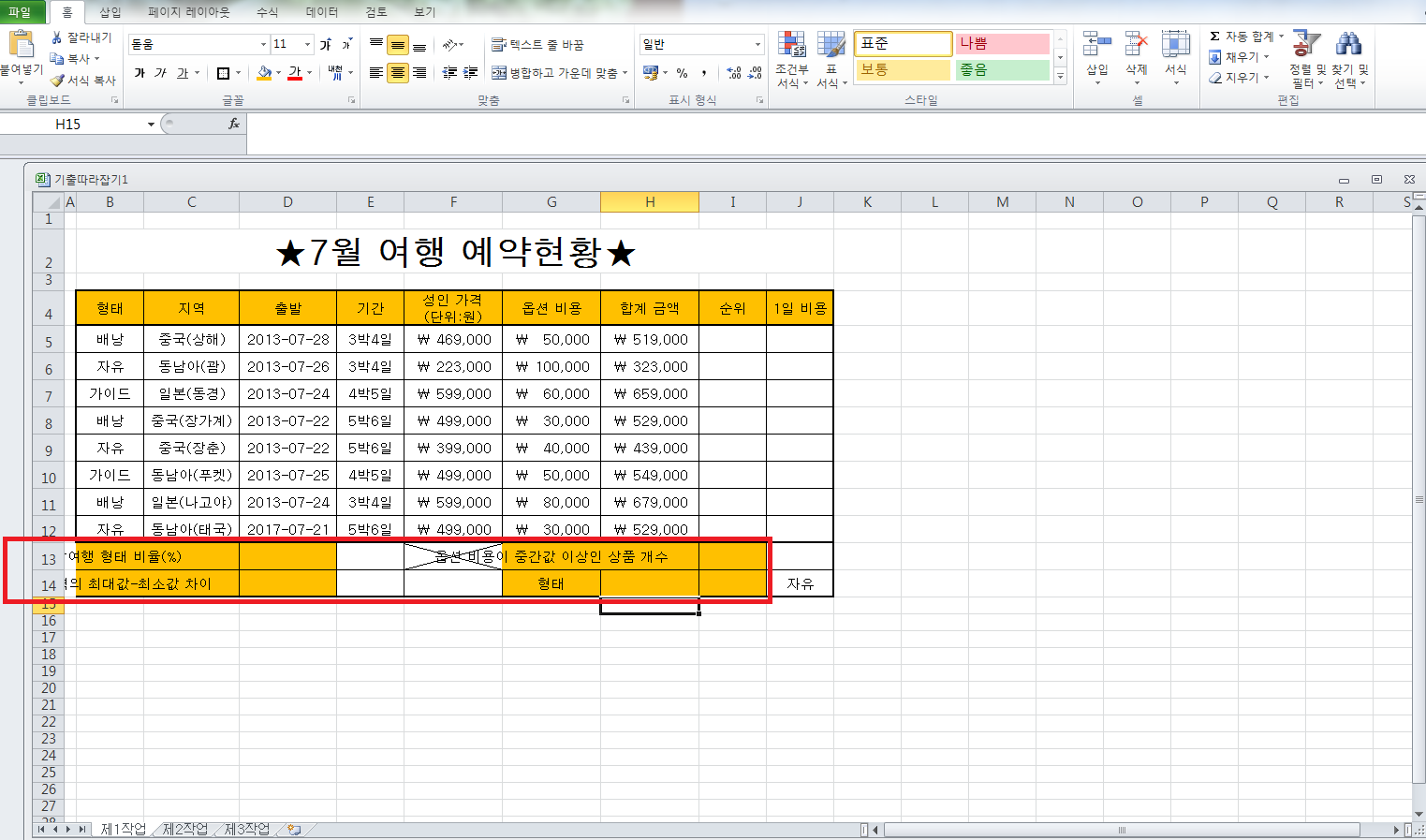 b13:c13 영역을 선택한 후 [홈]-[병합하고 가운데 맞춤]을 선택해주세요. 같은 방법으로 b14:c14도, g13:h13도 해주세요.