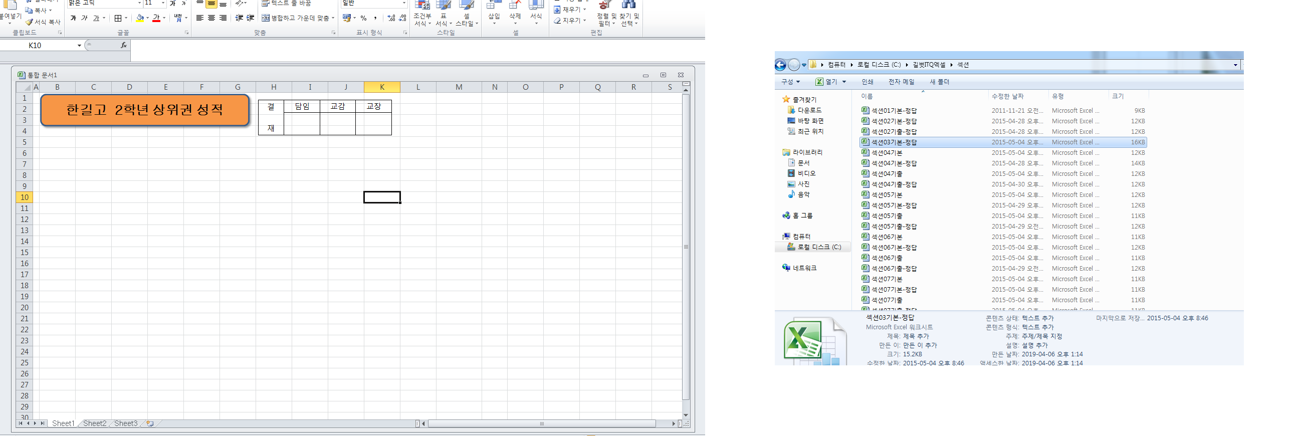 기본 정답 파일을 열어서 왼쪽 아래에 보면 sheet2라는 부분을 클릭해보세요. 여기에 기출 정답 파일이 들어가 있습니다.