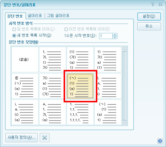 '문단 번호/글머리표' 대화상자의 '문단 번호' 탭에서 문단 번호 모양을 그림과 같이 선택한 후 <사용자 정의>를 클릭하세요.