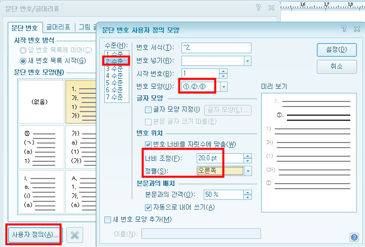 2. 아래 그림과 같이 문단 번호/글머리표에서 '사장자 정의'를 클릭 한 다음 교재 292p의 해설과 같이 '문단 번호 사용자 정의 모양' 대화상자에서 값을 지정해주세요.