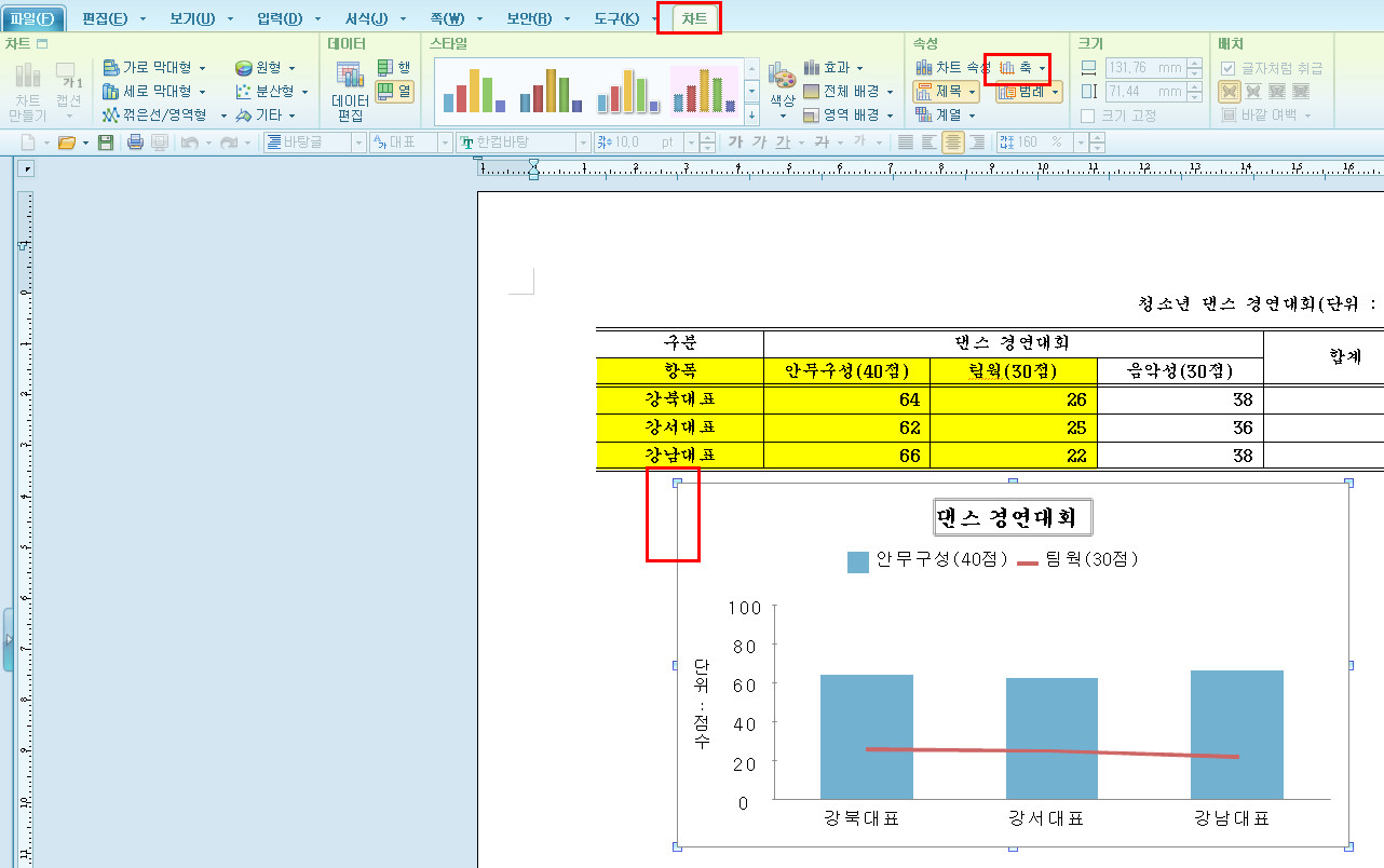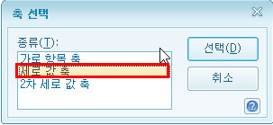 차트 편집 상태에서 마우스 오른쪽 버튼을 클릭하여 바로 가기 메뉴를 호출한 후 [축]을 선택하셔도 됩니다.