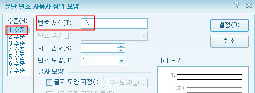 아래 그림과 같이 1수준 번호 서식에 오류가 있었습니다.