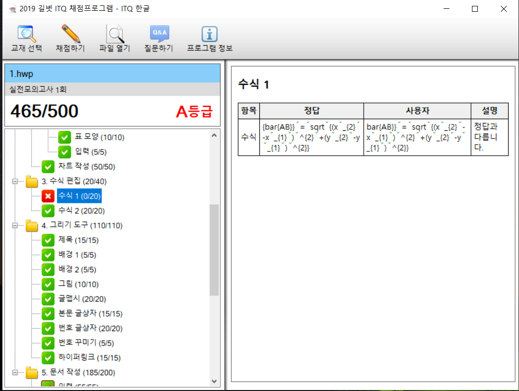 저희 채점 프로그램에서는 수식에서 수식편집기 아래 창의 내용도 보기 때문에 다를 경우 무조건 감점 시킵니다.