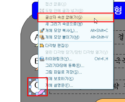 아래 그림처럼 글상자 속성 없애기를 선택한 다음 다시 도형 안에 글자 넣기를 지정하여 굴림, 20pt, 진하게를 설정해주세요.