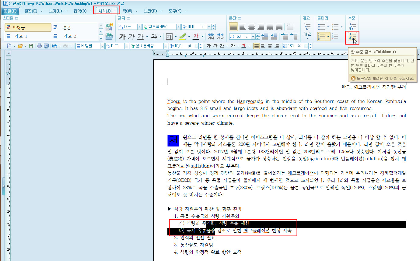 이것이 안되면 아래와 같이 메뉴에서 서식- 한 수준 감소 메뉴를 선택하시면 됩니다.
