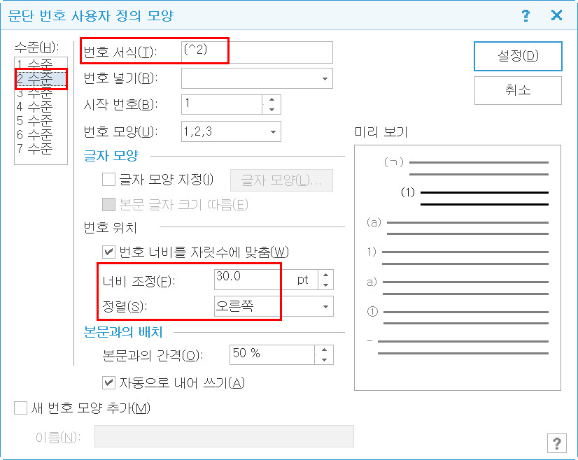 문단 번호 사용자 정의 모양의 1 수준, 2 수준의 번호 서식을 아래 그림과 같이 지정해주시면 됩니다.