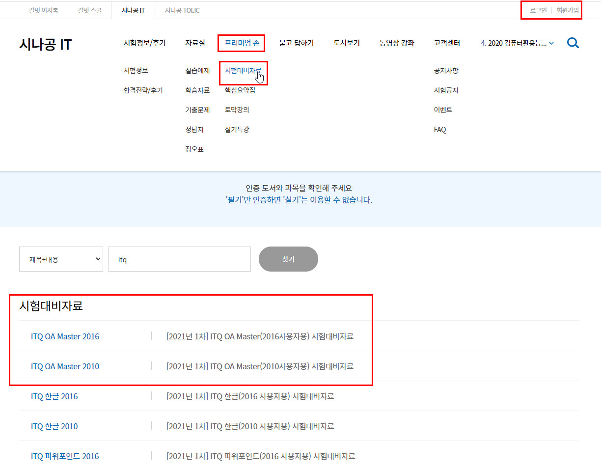 시나공 카페(sinagong.gilbut.co.kr)에 접속하여 우측 상단의 회원가입 및 도서 구매 인증을 한 후