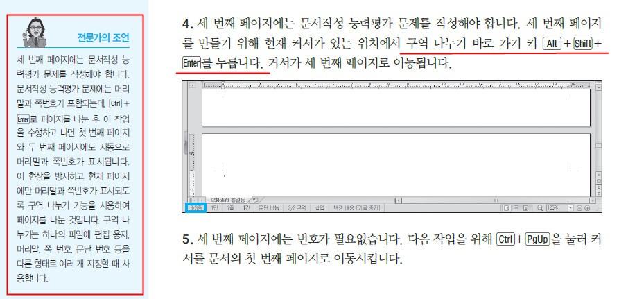 아래와 같이 교재에 제시된 방법대로 구역 나누기(Alt+Shift+Enter) 기능을 이용해 페이지를 구분하고 3페이지에 쪽 번호를 삽입했다면 1, 2페이지에는 쪽 번호가 표시되지 않습니다.