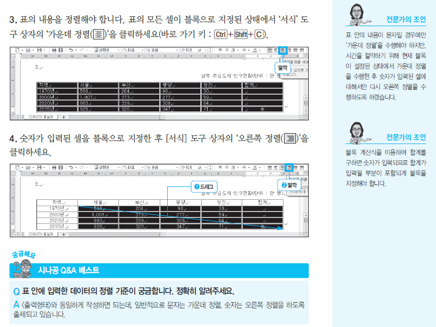 1. 표 안의 내용이 문자일 경우에만 ‘가운데 정렬’을 수행해야 하지만, 시간을 절약하기 위해 표 전체에 가운데 정렬을 수행한 후 숫자가 입력된 셀에 대해서만 다시 오른쪽 정렬을 수행하도록 합니다.