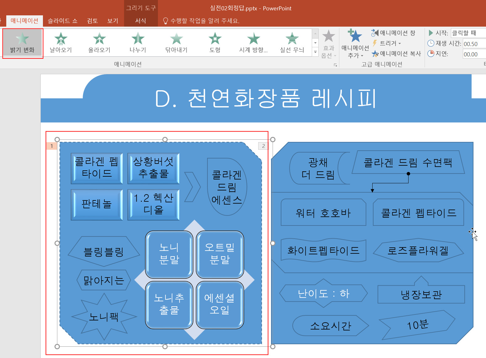 교재에 2 도형 편집에 실선무늬라고 뻐젓이 나와 있는데, 정답란에는 밝기 변화가 정답이라고 나와 있습니다. 제가 왼쪽을 그룹화하지 못해서 그런겁니까?