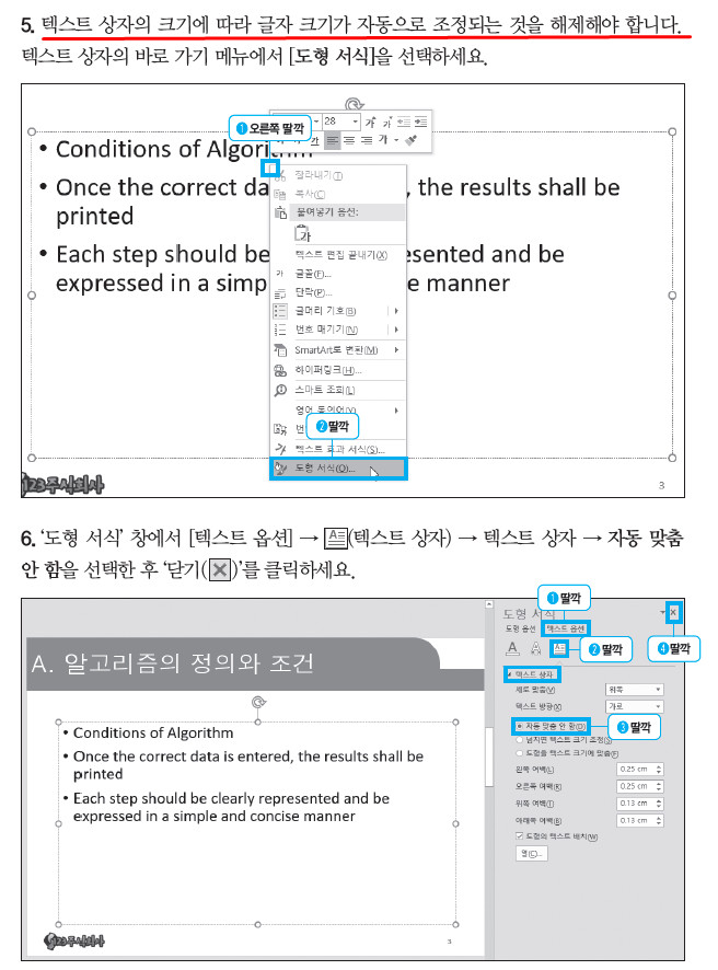 ITQ 파워포인트 시험에서는 문제에 제시되는 대로 글자 크기를 변경하고 텍스트 상자의 크기에 관계없이 글자 크기를 유지해야 하므로 ‘자동 맞춤 안 함’을 지정해야 합니다.