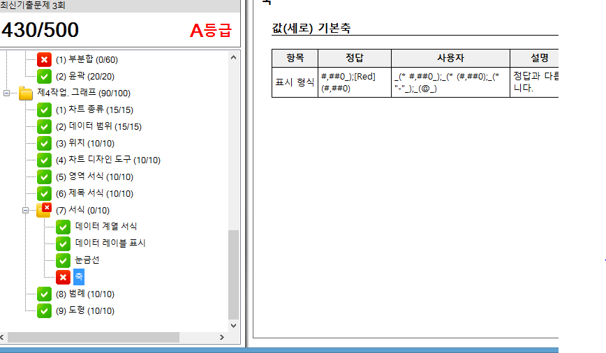 우선 실제 시험에서는 자동채점과 출력형태를 함께 보면서 채점을 합니다. 정확한 지시가 있는 경우에는 자동 채점을 이용하고 나머지는 출력형태를 보면서 채점을 하지요. 하지만 저희 채점 프로그램은 자동 채점만 제공하기 때문에 실제 시험처럼 출력형태로는 채점이 안됩니다. 그래서 저희 채점 프로그램은 정답 파일과 비교하여 조금이라도 다르면 무조건 감점합니다. 이런 부분들은 출력형태를 보고 동일하면 정답 처리하시면 됩니다.