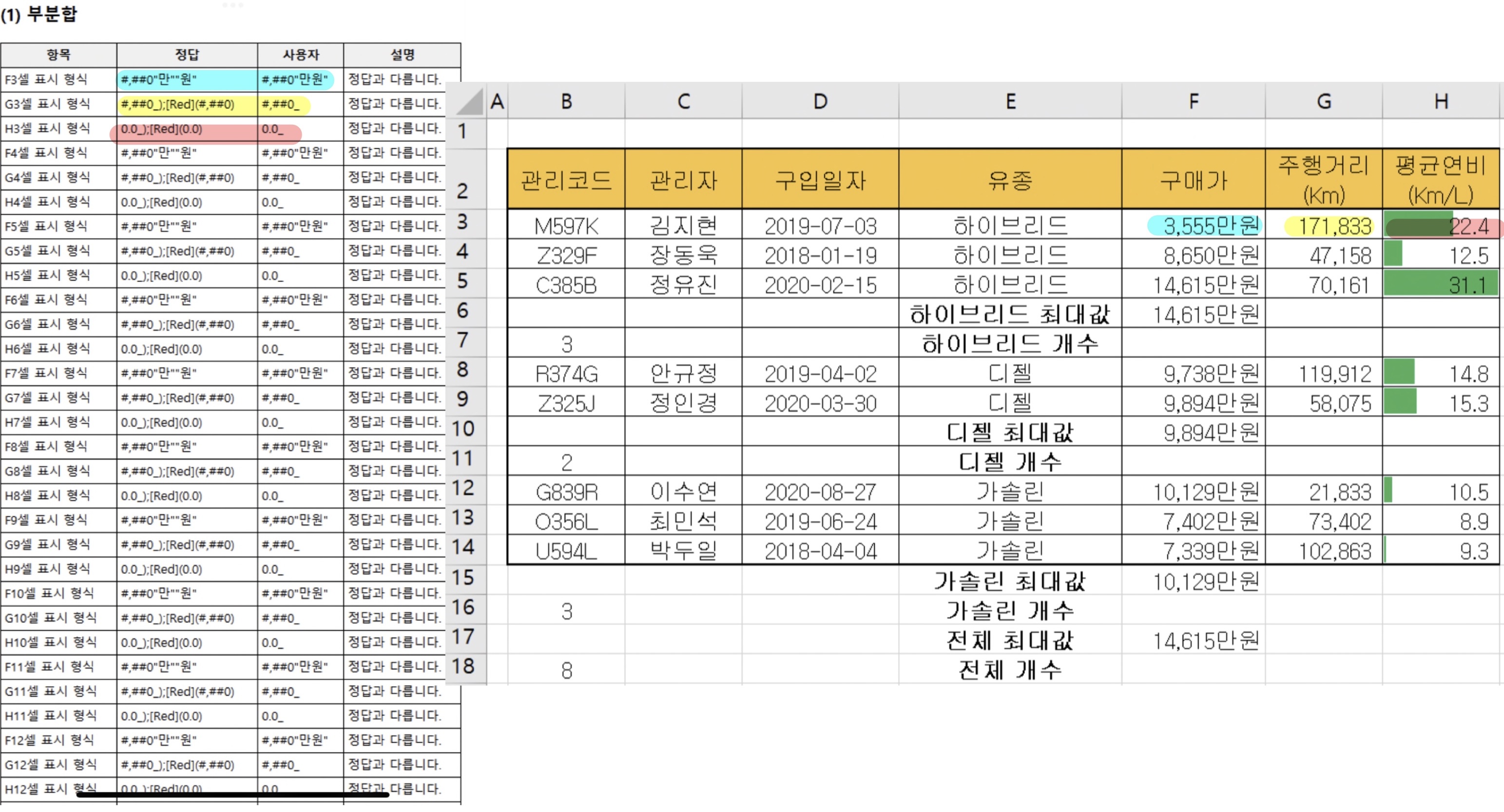 제1작업에서 G3 셀과 H3 셀의 표식 형식이 정답 파일과 달라 제1작업을 복사하여 작업하는 부분합에서도 감점이 발생하였습니다.