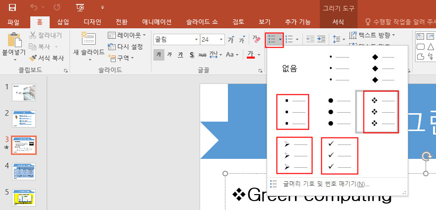 아래 그림과 같이 [홈] → 단락에서 글머리기호를 선택하시면 됩니다.