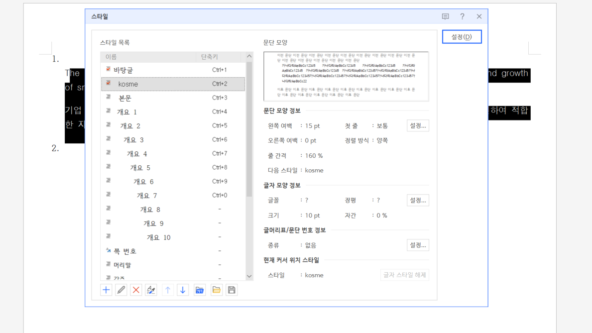스타일 편집 창 오른쪽에 있는 문단모양에서 직접 설정할 경우 추가한 스타일에 설정이 적용됩니다.(현재 이렇게 연습 중)