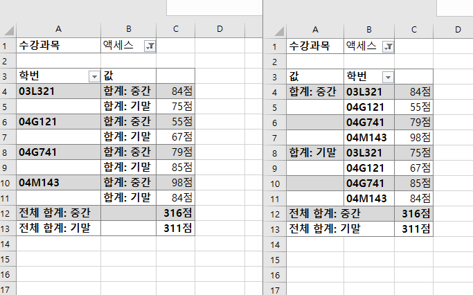 엑셀 섹션11문제 중 [기출01] 피벗테이블의 답이 틀린 것 같아요.