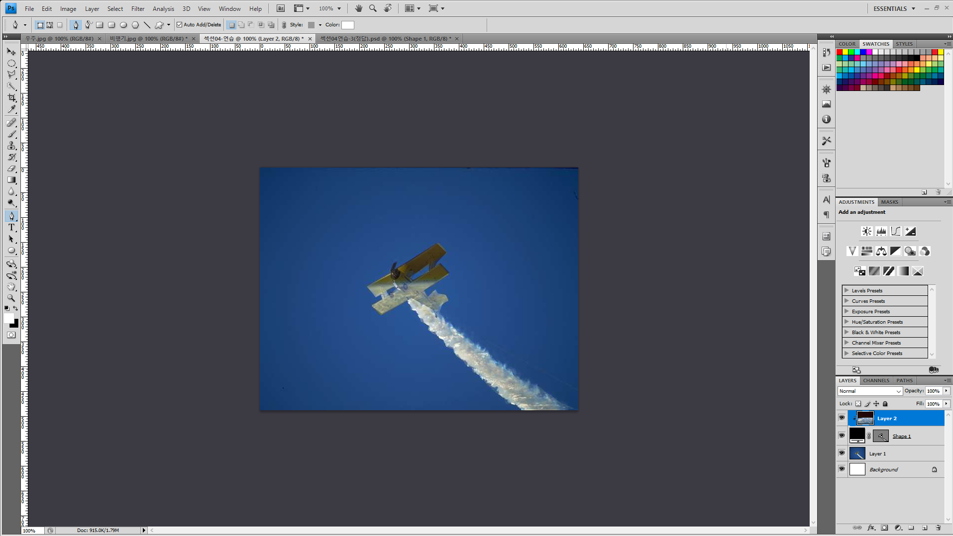비행기만 제외하고 바탕 화면을 패스로 만들어야 하는데 올려주신 그림을 보면 비행기를 패스로 만드신 것 같아요. 확인해 보세요.