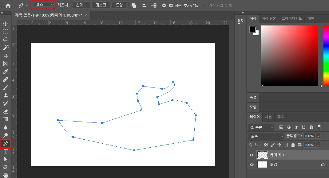 2. 펜 도구를 선택하고 옵션에서 패스(Path)를 선택한 후 오리 모양을 작성하세요.