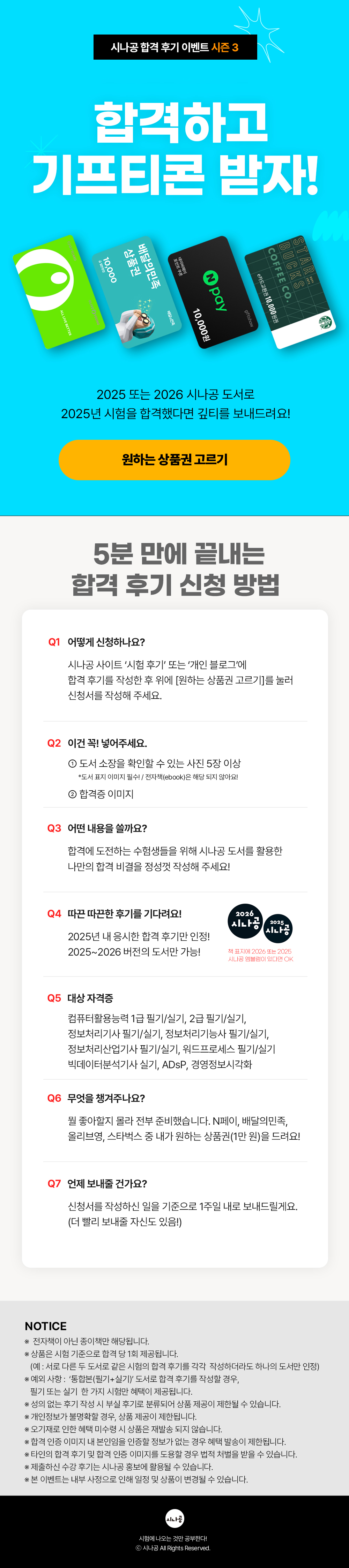 시나공*리자2025-03-11강*호 님, 동일 시험 필기 시험, 실기 시험 각각 시나공 교재로 공부한 후 합격 후기 쓰시면 각각 선물 보내드립니다!